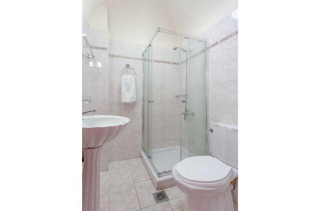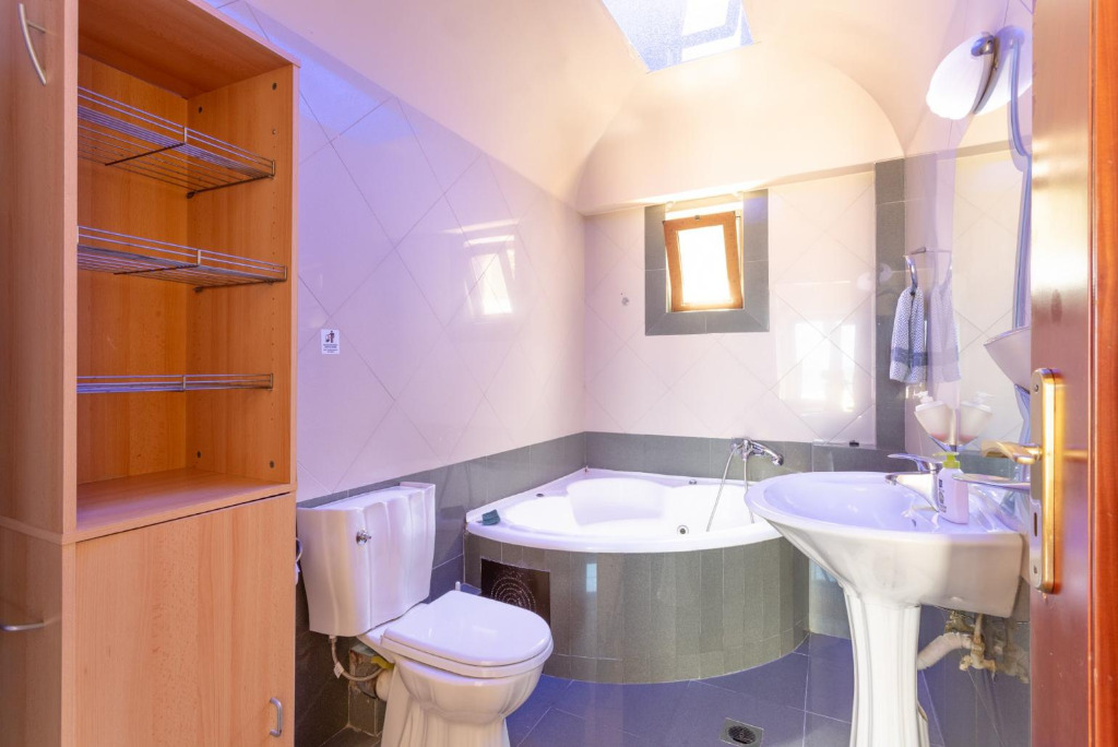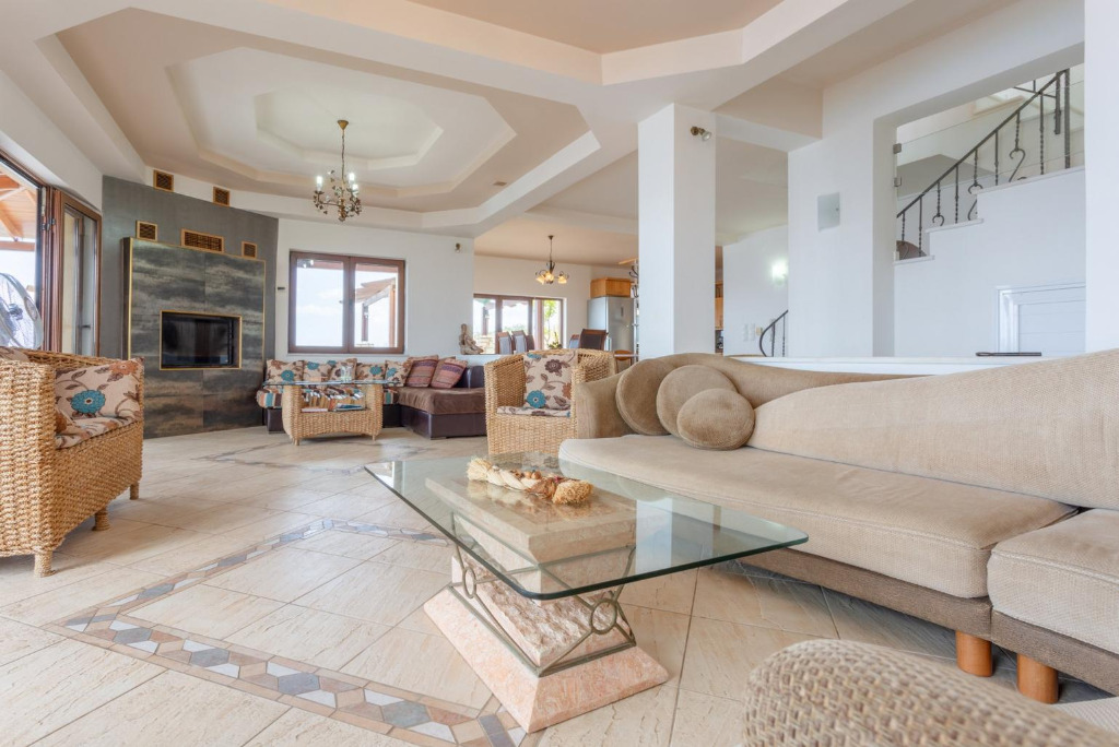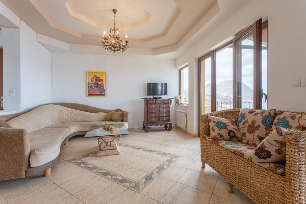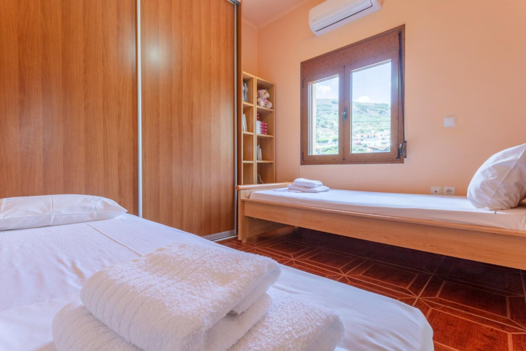 Das Haus ist auf 3 Ebenen gebaut. Der Eingang vom Haupthaus befindet sich auf mittlerer Ebene. Hier gibt es einen großzügigen Wohnbereich mit mehreren Sofas und Kaffeetischen. Es steht SAT-TV, DVD und Wifi Internet zur Verfügung. Weite Verandatüren öffnen zur überachten und möblierten Terrasse, von wo man die wunderbare Meersicht genießen kann. Die Küche ist schön hell und offen und bietet u.a. auch eine Spül- und Waschmaschine. Zudem gibt es einen Essbereich. Auf diesem Level befindet sich ein Schlafzimmer mit einem Doppelbett und ein Bad mit Dusche/WC. Eine interne Treppe führt in das obere Geschoss. Hierfindet man 3 weitere Schlafzimmer, zwei mit Doppelbett und eines mit 2 Einzelbetten. Die beiden Doppelzimmer haben Zugang zu einem Balkon. Zudem gibt es ein Familienbad. Die 4 Schlafzimmer im Haupthaus sind mit Klimageräten ausgestattet.