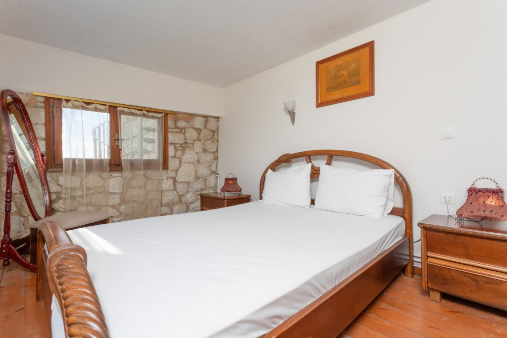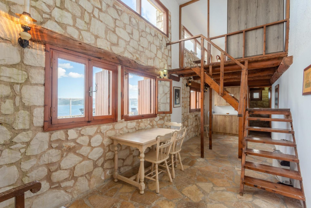 Auf Poolebene gibt es ein separates, rustikales, zweckmäßig eingerichtetes Studio. Es gibt einen Esstisch mit Stühlen, ein kleines Bad mit Dusche und in den Mezzaninen eine Treppe hoch, ein Schlafzimmer mit Doppelbett welches eine wunderbare Meersicht genießt. Dieses Studio hat direkten Zugang zum Poolbereich, der private Pool von 9 x 4 m (0.9 – 1.40 m tief) ist von Sonnenliegen und Schirm umgeben.